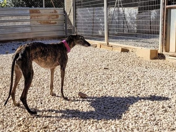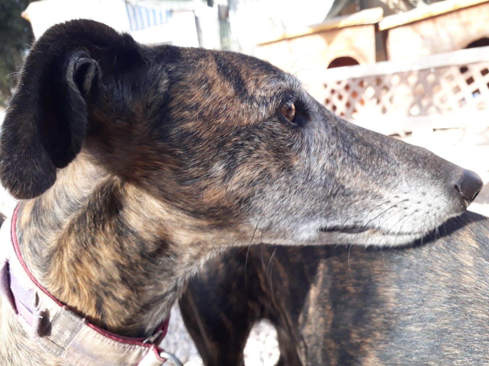Sol kam mit ihrer Schwester von einem Galguero ins Refugio in Murcia. Die hübsche Galga ist sehr sehr lieb und verschmust - zeigt sich im Refugio super sozial und pflegeleicht. Eine zauberhafte Langnase :) Auch der Katzentest fiel positiv aus.