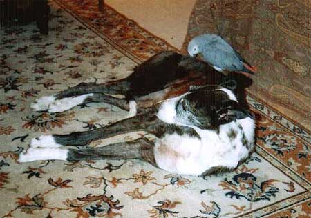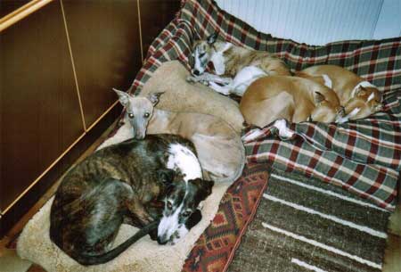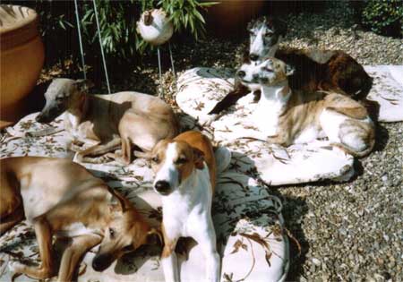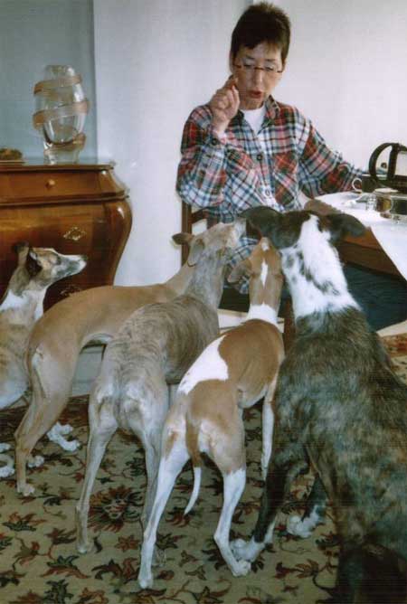 Sherry, der 14 – jährige schwarze Kater, lebt am längsten mit seinen Menschen zusammen. Nachdem sein Freund, ein Rauhaardackel verstorben war, zogen nach und nach einige hübsche Whippet – Damen in sein Heim ein. Da wären Fanny (8 Jahre), Hilary (7 Jahre), Thordis (5 Jahre) und Zypries (2½ Jahre). Alle Damen (unkastriert!) waren vom ersten Tag an freundlich zu Alma und nahmen sie ohne Probleme in ihr Rudel auf. Außerdem gehören zu dieser Wohngemeinschaft auch noch drei Graupapageien, Fritzi (26 Jahre), Fillipe (17 Jahre) und Kuckuck(14 Jahre). Unschwer zu erraten, wie er an seinen Namen kam.