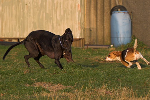 Sie liebt es ebenfalls, draußen ihren Gummitieren nachzurennen, die wir immer wieder schmeißen müssen. Ihre kleine Freundin Daisy, ein Pocket-Beagle möchte auch gern die Quietschetiere haben, aber Annie lässt das nicht zu und nimmt sie ihr unter großem Protest von Daisy immer weg. Wenn du sehen könntest, wie Annie sich auf dem unebenen Boden im Hundegehege zu bewegen gelernt hat, wunderbar. Anfangs dachten wir, sie bricht sich die Beine, und sie tat sich auch schwer, aber mittlerweile hat sie ein sehr gutes Verhältnis zu ihrem Körper und ihrer Schnelligkeit in kleinen Kurven und auf unebenem Boden. Sie sieht aus, als wäre sie in Rennkondition, hat also richtige Muckis, auch auf dem Rücken.