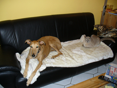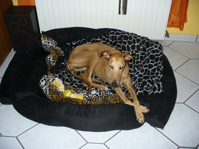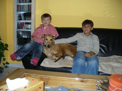 Mittlerweile haben wir 2 Söhne 6 und 9 Jahre und kauften uns 2003 ein Haus mit großem Garten (für den Hund). Tatsächlich hatten wir aber im Frühling 2010 immer noch keinen Hund, die Kinder sind beide sehr lebhaft und nahmen viel Zeit in Anspruch, zudem bin ich auch nach relativ kurzer Zeit wieder Teilzeit arbeiten gegangen. Im Jahr 2008 hatten wir das Tierheim Troisdorf am Tag der offenen Tür besucht und lernten dort die Greyhoundprotection kennen. Ich erhielt eine Visitenkarte von der damaligen Adoptionsbetreuerin und legte mir diese sicher weg. Im Jahr 2009 schleppte ich meine Familie wieder dorthin und im Mai 2010 überredete ich meine Männer zum Besuch der Kölner Rennbahn zum Event 4 Dogs. In den vergangen 2 Jahren ging ich immer mal wieder auf die Internetseite der Greyhoundprotection und schaute mir die Hunde an. Es war ein hartes Stück Arbeit, aber ich habe immer wieder meinen Mann daran erinnert und genervt, dass wir eigentlich das Haus mit dem großen Garten für einen Hund gekauft haben. Endlich hatte ich ihn weich geklopft und wir machten einen Termin mit der Adoptions-betreuerin bei den Pflegehunden fest. Leider stellte sich dann bei dem Besuch der Pflegehunde heraus, dass kein geeigneter Hund für uns dabei war. Der Hund musste einige Vorraussetzungen erfüllen: katzentauglich, kinderlieb (d. h. er durfte nicht schreckhaft sein), musste Mo-Do ca. 7 Stunden alleine bleiben können und sollte Treppen laufen dürfen. (Ja, solche Hunde gibt es wirklich und Bonnie ist so eine Hündin) Glücklicherweise sollten 2 Wochen später wieder neue Hunde von Spanien kommen.
