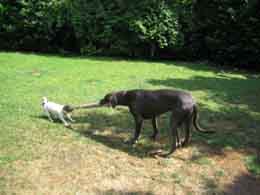 Dann ging es ins Haus, wo die Begutachtung bis in den Keller weiterging. Da war sie allerdings vorsichtig und zurückhaltend, eben auf Besuch. Mit dem Rüden ist alles von Anfang an entspannt und freundlich. Die Dogge Dörte benimmt sich etwas eifersüchtig und gouvernantenhaft (das war aber damals bei ihrem Einzug von Seiten des Rüden genauso). Sie hat Conchita bereits handfest gezeigt, was sie sich herausnehmen darf und was nicht. Das Mädchen ist sichtlich beeindruckt, wird aber von Stunde zu Stunde entspannter mit der Großen. Und diese dankt ihr die Zutraulichkeit mit großzügiger Freundlichkeit. Was unser Schnellmerker noch nicht mitbekommen hat: Conchita hat ihr den Lieblingsknochen im Garten vergraben.....