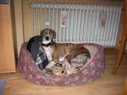 "Da sind wir wieder! What a day! Heute war alles anders. Kein Dauerprotest beim morgendlichen Abschied, keine Zerstörungen bei der Rückkehr. (Meine Kinder hatten ein Auge und Ohr drauf, da ich heute arbeiten war). Die Spaziergänge heute waren auch gesitteter. Ich nehme an, dass sich ihr ungestümes Verhalten bei der Begrüßung fremder Hunde und ihr anschließendes "Kleben" an ihnen ("die sollen bei uns bleiben!") legen wird, wenn solche Treffen immer mehr zum Alltag werden. Nachdem wir gestern Abend noch bei der letzten Runde einen heftigen Zusammenstoß miteinander hatten, sie sprang mir unvermittelt vor die Beine, ich bin in sie rein gelaufen und habe mir an ihren spitzen" A"- Knochen sehr schmerzhaft die Kniescheibe gestoßen, so dass ich erst mal ´ne Runde auf dem Feld geheult habe, und sie auf dem Heimweg die Richtung bestimmen wollte ("jetzt noch mal in den Park, da war es so spannend! Ne, dann geh ich eben gar nicht mehr weiter!") habe ich ihr gezeigt, dass ich so was bei aller Liebe nicht dulde. Meine beiden anderen ließen die Ohren hängen. Sie kannten den Ton bereits. Zuhause fing das Ankläffen wieder an, als mein Sohn unbekannterweise im Bademantel die Wohnung betreten wollte. Da ich gerade einen Handfeger zur Hand hatte, landete dieser auf ihrem Rücken. Die Wirkung hält noch an..... Beäugte mein Tun eben beim Saubermachen misstrauisch. Und jetzt der Hammer!!! Conny ist heute schon zweimal freiwillig zum Gassi gehen ins Auto gesprungen!! Und wir haben miteinander gerauft, so mit Hand ins Maul nehmen und anstupsen! Zu süß! Das Spielen im Garten - ich scheuche Conchita - klappt ja schon seit dem zweiten Tag. Und noch ein Fortschritt: seit heute Nacht ist sie nicht mehr dauernd um mich, sobald ich mich im Haus bewege. Sie bleibt auf ihrem Lieblingssessel liegen (auch nachts bleibt sie bei den Hunden; bei mir ist es allen zu kalt) und beobachtet relaxed das Geschehen. Finde ich ganz toll! Und Einkaufen bei Aldi mit „im Auto warten“ hat heute auch prima geklappt! Du siehst, Rosi, ein Hoch folgt dem Tief und so schaffen wir auch die trüben Tage. Ich muss jetzt Schluss machen. Gerade hat sich eine Langnase auf mein Bein gelegt und der Rest will geknubbelt werden!