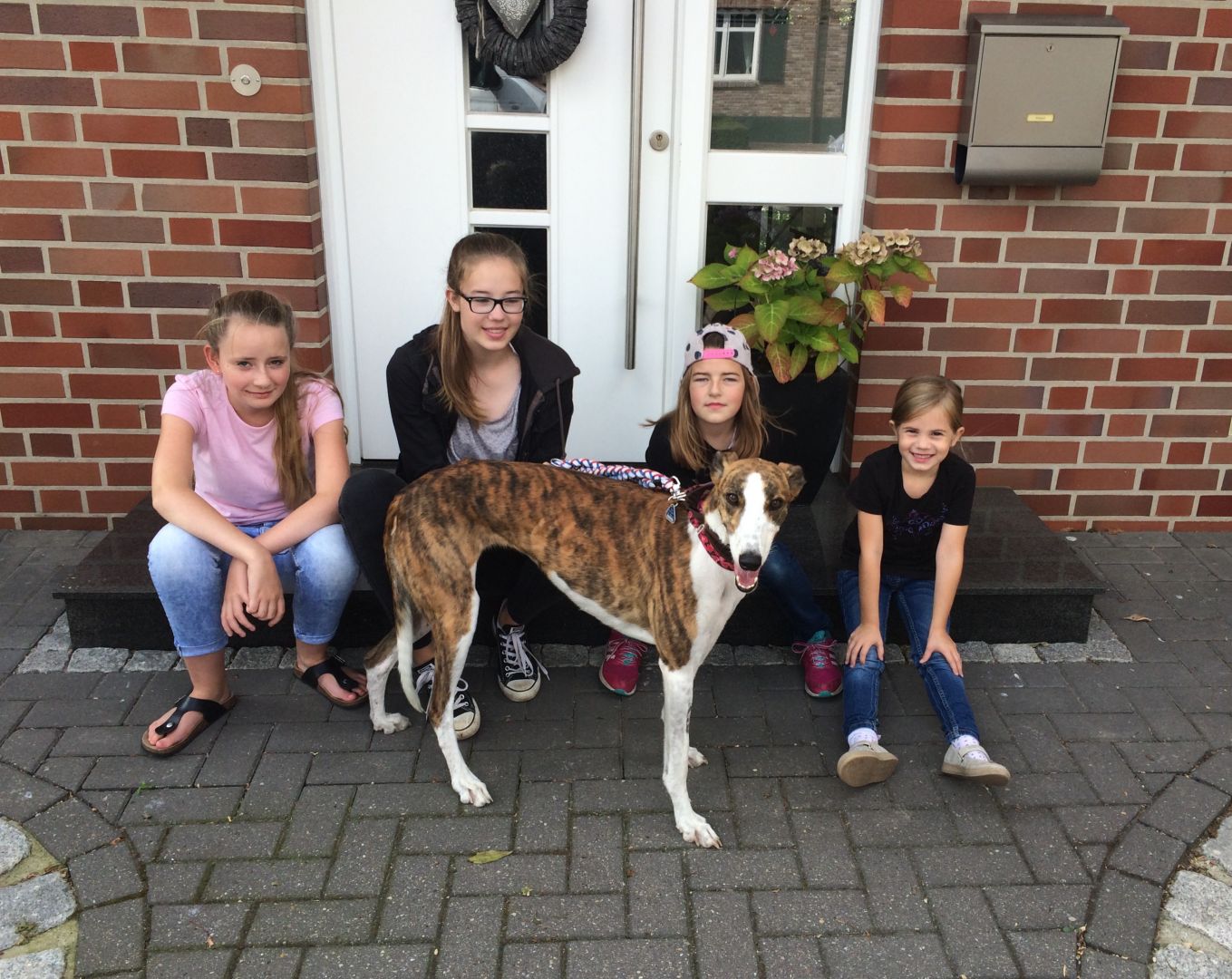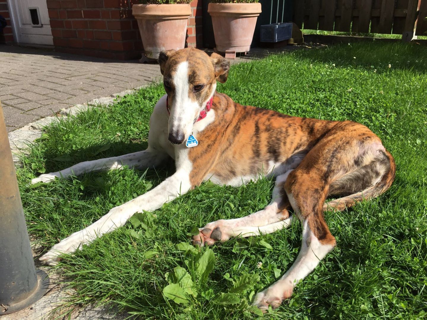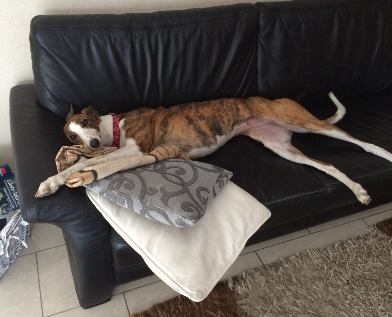 Dann stand der erste Tierarztbesuch an. Dieser stellte fest, dass ihre Zähne aufgrund der Vorgeschichte, wohl nicht in so gutem Zustand waren. In einer OP wurde ihr ein Zahn gezogen und der vorhandene Zahnstein entfernt. Wegen ihres Hüftbruches, den sie im August 2015 erlitten und deswegen aus dem Renngeschäft ausgeschieden war, hat sie eine leichte Arthrose an der rechten Hinterseite, was ihr aber nicht hinderlich ist. Ansonsten war alles super in Ordnung. Das Fell wird immer weicher und die Liegeschwielen an den Ellenbogen sind ganz verschwunden.