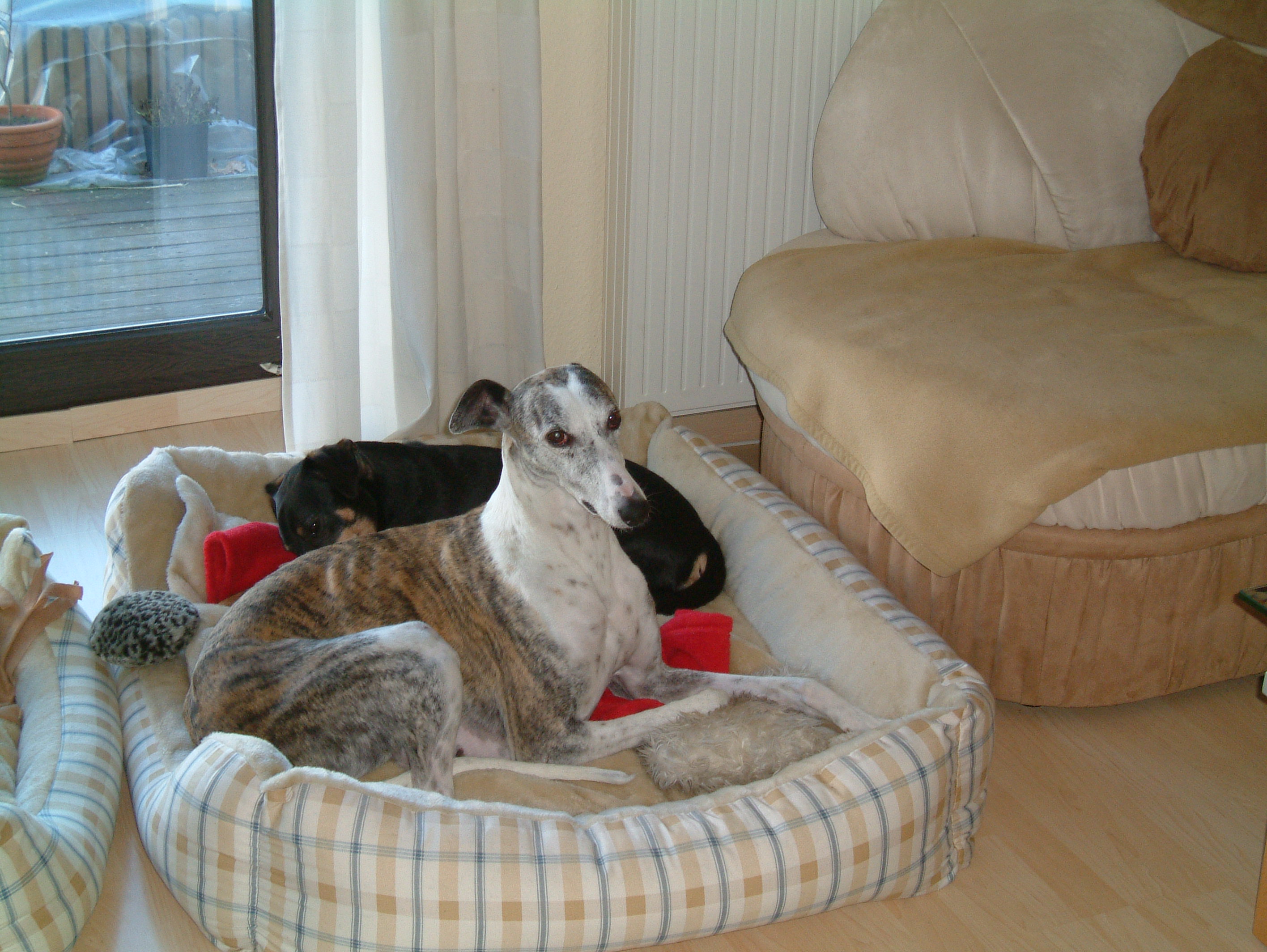 Eva haben wir jetzt umbenannt in Ghia. Bei uns gibt es zu viele Evas im Umfeld. Sie ist eine ganz liebe Hündin, vertraut uns ohne Ende und ist total verschmust. Nachdem wir telefoniert hatten, war ich mit ihr im eingezäunten Freilauf. Es ist tatsächlich so gewesen, wie Sie es vermutet hatten, sie hat gar keine Lust zu toben. Sie ist einmal über den Rasen gerannt und dann hat sie bei mir gelegen. Ich habe sehen können, wie super sozial sie ist. Sie hat die anderen toben lassen, und wenn es ihr zu heftig wurde, hat sie nur kurz geknurrt. Als jemand mit seinem Hund am Zaun vorbei ging, sind alle Hunde zum Tor gelaufen und haben gebellt, Ghia ebenfalls. Ich habe sie gerufen und sie hat während des Laufens inne gehalten und ist sofort zu mir zurückgekommen. Sie ist abrufbar und hört auf uns. Das war ein super Erlebnis, ich war total gerührt. Von da an war das Eis geschmolzen. Sie ist nun wirklich mein Hund und zeigt es mir täglich. Sie lief sogar ohne Leine neben mir „bei Fuß“, natürlich auf dem großen eingezäunten Gelände. Wir haben festgestellt, dass sie nicht toben will und auch nicht unbedingt Freilauf benötigt, es macht ihr nichts aus nur an der Leine zu gehen, da sie eh gern nah bei uns ist. Sie ist ein richtiges Schätzchen. Zumindest solange wir nicht im Feld sind. Denn da steht sie unter Strom und zeigt ihren Jagdtrieb, wenn sie einen Hasen sieht. Dann beißt sie vor Energiestau in Eddies Leine, der bekommt immer vor Schreck riesige Augen. Inzwischen haben wir herausgefunden, dass sie sich draußen an Eddie orientiert. Wenn er wegen anderer Hunde Theater macht, dann macht sie auch kräftig mit. Ist er still, fiepst sie nur vor sich hin. Aber manchmal fängt auch sie an. Wir haben uns jetzt damit arrangiert. Ob nun einer an der Leine tobt oder zwei, ist jetzt auch egal. Irgendwie wird die Zeit es bringen. Ich fange jetzt an zu üben und manchmal gehe ich in Gebiete, wo man Hunde trifft. Sie ist da manchmal aus dem Häuschen und springt dann an mir hoch und ist kaum zu bändigen. Vor zwei Wochen hatte ich einen super Hexenschuss, da ein Hase direkt neben uns aus der Furche gesprungen ist und wir nicht damit gerechnet haben. Da war es auch schon geschehen. Nun bin ich wieder okay. Manche Tage stresst es schon, dann denke ich mir aber: “Sie kann ja nichts dafür.“ Eigentlich, wenn man drüber nachdenkt, tut sie einem Leid, weil sie ja nicht anders kann, im Feld total angespannt ist und nur auf Ausschau, durch nichts abzulenken. Wie in einer anderen Welt. Wenn wir im Wald sind, sieht man, dass sie viel entspannter ist. Sonst liebt sie ihr Leben, sie liegt gern auf der faulen Haut und fährt so gern Auto, dass sie nicht aussteigen will. Sie geht gern spazieren, aber nach max. zwei Stunden ist sie fertig und dann will sie nur noch schmusen, schmusen, schmusen und fernsehen. Sie hat super glänzendes Fell bekommen und ihre Augen leuchten. Ihr geht es gut und uns geht es gut mit ihr. Wir haben vorige Woche gesagt, sie ist unser Hund. Sie passt total gut zu uns, als wäre sie für uns geboren. Eddie liebt sie auch, er leckt sie immer ab und putzt sie von Kopf bis Fuß, und sie genießt es. Nur manchmal knurrt er, weil sie sich etwas grob motorisch bewegt, und wenn sie sich zu Eddie legen möchte wie ein Elefant herumtrampelt und auf ihn tritt oder sich auf ihn legt. Dann geht er genervt und sie schaut ihm nach und versteht nicht, warum er nicht kuscheln will. Da müssen wir oft lachen, wir haben sie unsere "Grobmotorische" getauft, wobei man beim Essen klauen nichts davon merkt, da kann sie wie eine Katze schleichen. Vor Wochen hat sie einen Topf mit Inhalt vom Herd geklaut und auf ihren Platz getragen, um seinen Inhalt genüsslich zu verspeisen. Sie kriegt noch nicht mal Durchfall danach. Überhaupt ist sie da ganz leise und ich hätte es nicht bemerkt, wenn ihr die Kelle nicht aus dem Topf gefallen wäre. Wir sind also alle superglücklich. Nach Ostern melde ich mich noch einmal, da wir Sie ja gern besuchen wollen. Mein Mann kommt heute von der Montage zurück und dann sind wir wieder alle vollständig.