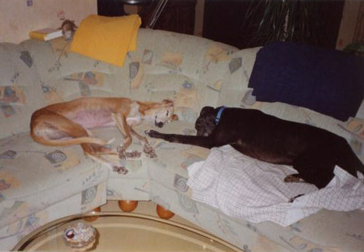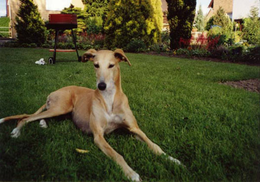 Am 07.07.2001 haben wir unsere Galgohündin Goldi bei Resy in Holland abgeholt. Ursprünglich sollte sie wohl dort vermittelt werden. Unsere Erwartungen waren sehr groß, aber auch die Ernüchterung, als wir mit ihr unser Heim in Lehrte erreichten. Treppen steigen, Türen durchgehen oder an der Leine GASSI gehen stellte sich als anfänglich unüberwindbar dar. Doch das liebe und ruhige Wesen von Goldi und ihre Neugier und Gelehrigkeit belohnten unsere Geduld. Die Stubenreinheit stellte sich schon nach wenigen Tagen ein.