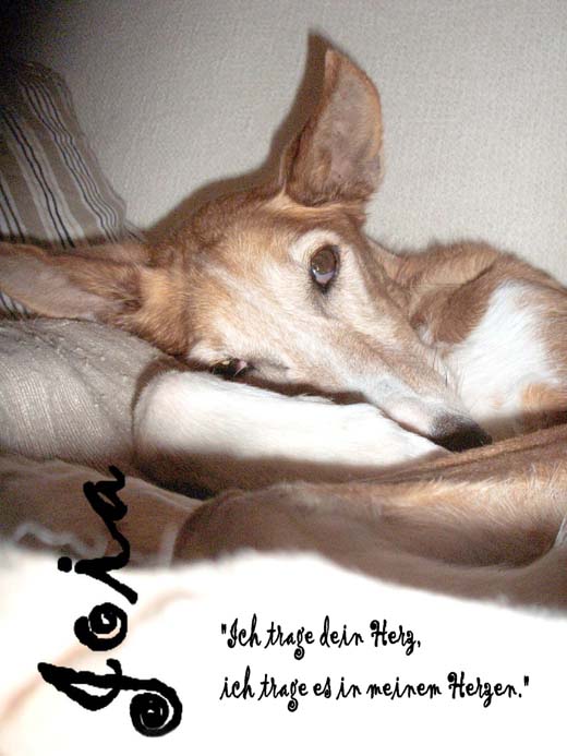 Im Oktober fing sie plötzlich an, aus der Nase zu bluten. Die ersten 3 Male schien sie es gar nicht wirklich wahrzunehmen. Ich hatte wieder ein bisschen Hoffnung, es würde sich doch um Ehrlichiose handeln und wir könnten doch entgegenwirken. Wir haben gleich mit Antibiotikum angefangen, aber Joia wurde zunehmend schwächer. Ein paar Tage später blutete sie mehrere Stunden… das Antibiotikum hätte eine Wirkung haben müssen, es war also endgültig nicht Ehrlichiose. Eine Woche nach der ersten Blutung, am 14.10.09 hatte sie einen furchtbaren Krampf, sie fiel in meinen Armen zusammen. Danach schwebte sie zwischen den Welten, war nicht mehr ansprechbar. Die Tierheilpraktikerin stellte noch einen letzten Behandlungsplan zusammen, sie sollte keine Schmerzen, keine Krämpfe haben. Ich musste meine ganze Kraft zusammen nehmen, um Joia jetzt ein starker Partner zu sein. Ich sagte ihr auch, ich sei mit ihrer Entscheidung einverstanden, innerlich hat mich jedoch meine Hilflosigkeit zerrissen. Ihr Körper ist nun zu müde geworden, um die Lasten ihres Lebens weiter tragen zu können…