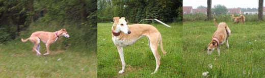 Sehr stolz bin ich auch auf mein Mädchen, weil sie auf ausgewählten Spazierstrecken frei laufen kann. Selbstverständlich fahre ich dafür in meine alten Podenco erprobte Lieblingsfelder spazieren. Hier kann man sich stundenlang aufhalten, ohne vielen Spaziergängern zu begegnen. Es gibt an einer Stelle ein umzäuntes, ziemlich wildes Stück Feld, da leben mit Sicherheit auch Kaninchen drin. Eines Tages rasten plötzlich Klara und Lilli was das Zeug hält entlang des Zaunes, da ist mir kurz etwas mulmig geworden, denn die Strecke/ Entfernung war mir schon zu weit. Ich blieb stehen und rief die wild gewordenen ;-) Jägerinnen, auf meine ungarische Teufelin konnte ich mich verlassen, aber mit Klara war es eine neue Erfahrung… zugegebenermaßen mit Herzklopfen verbunden. Aber sie blieben rasch BEIDE stehen, Lilli machte kehrt und Klara guckte noch mich und den Zaun an… und dann raste sie im selben Tempo zu mir zurück! Nun ja, die Hundewurst ist eben unwiderstehlich ;-)