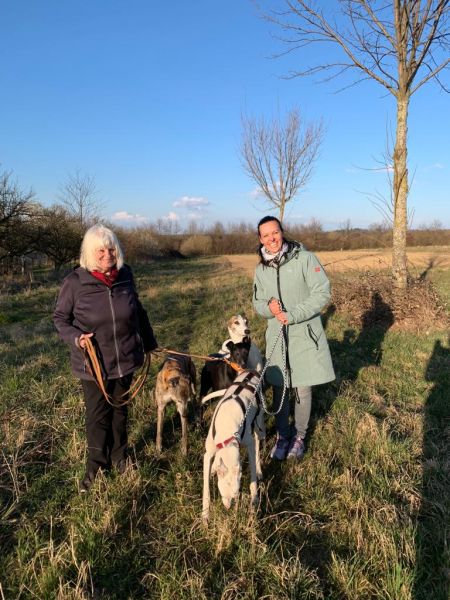Doch kaum waren die Greyhounds Usain, Fia und Roxxyn an seiner Seite und gingen ihm voran, war Leon direkt viel sicherer. Eine erste kleine Runde im Grünen bei strahlendem Sonnenschein wurde gemeinsam gedreht.