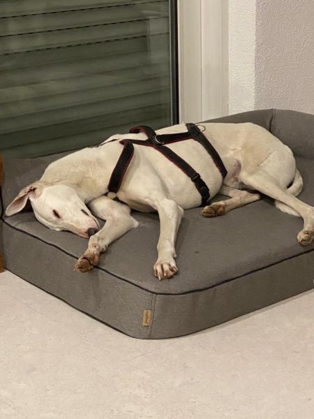 Leon schlief in seinem orthopädischen Hundebett direkt ein. Inzwischen tobt Leon schon herum, rennt die freitragenden Treppen hoch und runter wie nix. Ganz cleverer aber sehr sehr schmusiger freundlicher Hund.