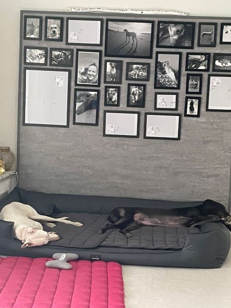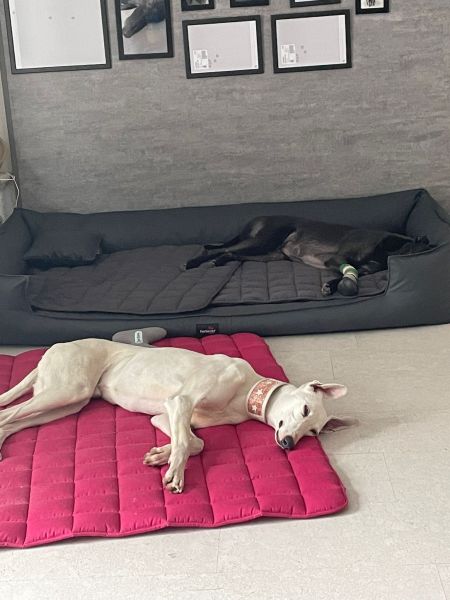 Im luxuriös großen Auto seiner Pflegestelle wartete ein weiches frisches Bett auf ihn und kaum drin, schlief Leon erschöpft ein. Zuhause angekommen, erfolgte die Begrüßung der Familien-Greyhounds Makani, Amadou und Tabita.