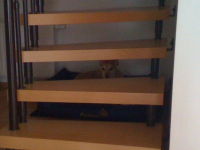 Aber wenn ich mich mal wieder erschrocken habe oder meine Ruhe haben möchte, lege ich mich einfach in meine Höhle unter die Treppe. Dann habe ich noch eine ganz tolle Schmusedecke bekommen. Auf die legen sich meine Mama und ich und dann bekomme ich meine Streicheleinheiten. Das ist vielleicht schöööönnnnn ………. ![]()