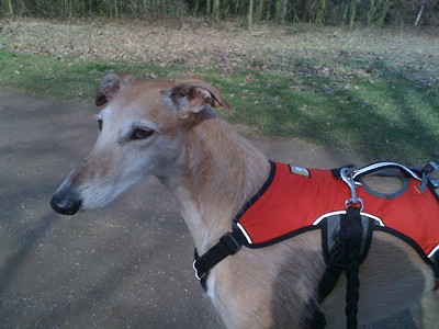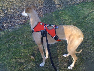 Ach habe ich Euch eigentlich schon von meinem Fluchtversuch am dritten Tag erzählt? Beim Drehen unserer Abendrunde mussten wir ein großes Stück an der Straße vorbei laufen, die aber um diese Uhrzeit nicht mehr viel befahren war. Die Dunkelheit, die Aufregung und der Mann der die Mülltonnen schob, haben mich dann so aus der Ruhe gebracht, dass ich nur noch weg wollte. Nach diesem sehr einschneidenden, dramatischen Erlebnis für alle Beteiligten, trage ich beim Spazierengehen jetzt nur noch ein schickes, aber ausbruchsicheres Geschirr.