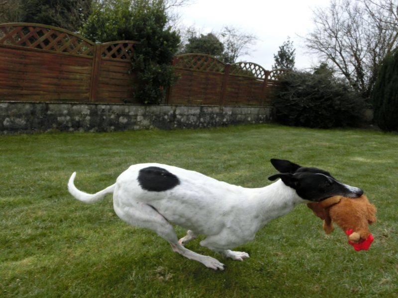 Molly spielt mittlerweile total ausgelassen mit ihren Stofftieren und liebt es sich von Lucy durch den Garten jagend zu lassen. Falls sie Lucy nicht zur Verfolgungsjagd animieren kann, dreht sie auch gerne ein paar „dolle“ Runden im Garten alleine.