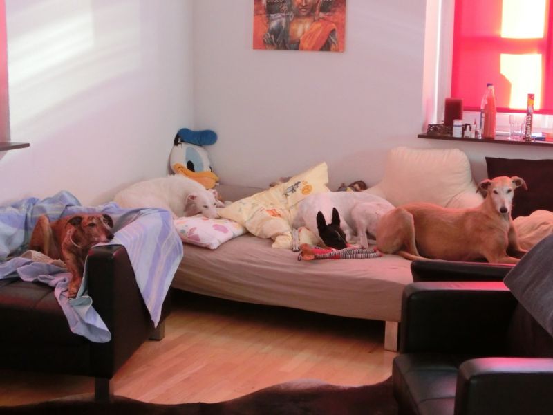 Wir verbrachten den Mittag bei Karin und ihrem ganzen Rudel. Nach kurzer Eingewöhnungszeit und einem langen ausgiebigen Spaziergang suchten sich alle Hunde ihren Platz. Da Alskling schon auf einem gemütlichen Sofaplatz lag, setzte ich mich zu ihr und streichelte sie ein wenig. Lucy kam nach kurzer Zeit zu uns, stieg mit auf das Sofa und legte sich direkt neben Alskling. Dort blieb sie auch liegen, als ich schon längst wieder aufgestanden war.