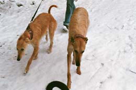 Alle drei lieben natürlich Spaziergänge. Luna und Nice können frei laufen. Naria an der Leine ist aber immer vorne dabei, und wenn sie einmal läuft, dann... Hier zeigt sie sich als sehr selbstsichere Hundedame und sieht einfach alles, ob Vogel im Gebüsch oder Mäuschen in der Wiese, da kommt der Jagdtrieb durch. Selbst jetzt der Januar 2009, der diesmal bitterlich kalt ist, scheint Naria nicht zu stören. Die Nase im Schnee und Hauptsache laufen.