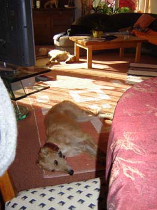 Da Luna sehr viel Beschäftigung braucht, entschieden 2003 mein Mann und ich uns für den zweiten Hund. Es sollte diesmal ein wirklicher Galgo sein. Aus dem Internet wusste ich von einer sehr engagierten Tierschützerin – Yera Halabi. Da wir im September 2003 dort unseren Urlaub verbrachten, riefen wir bei ihr an und fragten, ob sie wüsste, wer evtl. einen Galgo vermittelt. Tat-sächlich nannte sie uns zwei Tierschutzvereine, die Galgos zur Ver-mittlung hatten. Einer war in der Nähe von Torre del Mar, der andere war bei Granada, Albolote. Da Torre näher lag, be-suchten wir dort die erste Galgamixhündin, eine wunder-schöne weiße, ebenso ein Powerpaket wie Luna. Mein Mann wollte aber unbedingt noch nach dem 240 km entfernten Granada, um die andere Galga zu sehen. So lernten wir Helga Giessler kennen. Mein Mann sah diese Galga und erklärte mir sofort, dass ist unser Hund. Ich weiß nicht warum - sie war es einfach, diese kleine, zierliche, gestromte Galga. Die großen Augen, die sich verfärben konnten - je nach Sonne - grün oder hellbraun. Diese kleine Galga namens Julietta hatte sich sofort in unser Herz geschlichen. Wir waren von Julietta so begeistert und auch unsere Luna war von ihr angetan. Wir mussten noch fast 4 Wochen warten, sie durfte mit dem Flieger nachreisen. Es war die beste Entscheidung auch einmal einem Windhund, einem Galgo, eine Chance zu geben. Sie war anfangs eine sehr, sehr ängstliche, panische Hundedame. Sie war auch eine große diebische Elster. Nichts war in der Küche vor ihr sicher, aber eine Schmusebacke ohne Ende. Gerne stupste sie mit der Schnauze, bitte weiterstreicheln. Nur bei Unsicherheit drehte sie sich panisch in der Leine. Helga hatte uns wegen ein paar Fragen zur Haltung von Windhunden an Familie Jordan verwiesen. Wir wollten unserer Julietta "windhundgerecht" sein. Familie Jordan stand uns telefonisch öfters mit Rat zur Seite. Persönlich hatten wir uns leider nicht kennen gelernt.