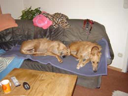 Seit Oktober 2008 ist bei uns nun der dritte Hund eingezogen. Bis heute haben wir nicht einen Tag bereut. Oft denken wir, Naria ist doch eigentlich schon länger als zwei Monate bei uns. Wir sind glücklich mit dieser Entscheidung. Nice und Naria haben sich zu meinem "Pattex" entwickelt, wo er hingeht ist sie sofort dabei. Diese beiden kommen immer im Doppelpack, eben Galgos. Sie stürmt als erste in die Küche, wenn’s nur kurz raschelt. Und zugenommen hat das Mäuschen auch. Sie mag Gurken, Karotten, gekochte Eier und Bannen und........