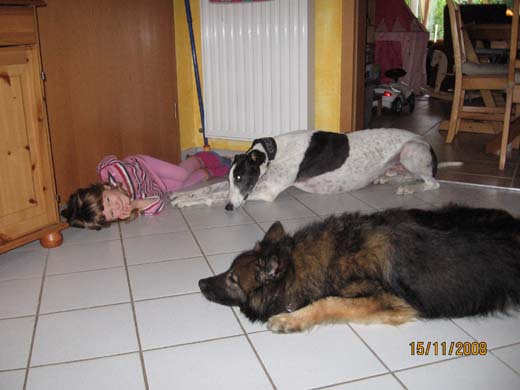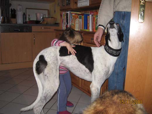 Anfangs haben wir ihn gerade im Umgang mit unserer Tochter besonders aufmerksam beobachtet, da wir ja davon ausgehen mußten, dass er keine kleinen Kinder gewöhnt war. Er fand Amelie von Anfang an ganz toll und war in Ihrer Nähe oft richtig aufgeregt, was sich dann zum Beispiel darin geäußert hat, dass er ihr an den Haaren geknabbert hat (genau dieses Verhalten hat unser verstorbener Rüde Sammy immer bei unserer Hündin Lara gezeigt, wenn er Frühlingsgefühle hatte). Obwohl Amelie große Hunde gewohnt ist, war ihr das dann doch manchmal zu viel und so haben wir Patchy einfach verboten, an Amelies Kopf zu gehen. Daran hält er sich bis heute ausnahmslos. Mittlerweile sind kleine Kinder für ihn auch nicht mehr so aufregend; er interessiert sich zum Beispiel überhaupt nicht für Amelies Freunde, so dass wir ohne Probleme auch Kinder einladen können, die große Hunde eher nicht so toll finden.