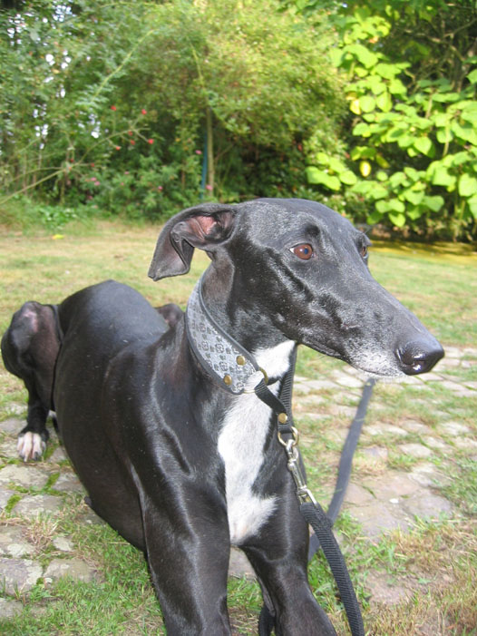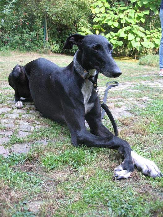Vorab muss gesagt werden: unsere Galgohündin Viva, sie ist an einem Hinterlauf amputiert, ist im Jahr 2005 ebenfalls aus dem Tierheim Albolote von Helga zu Nina und Karl-Heinz auf die Pflegestelle in Willich gekommen und wurde unser zweiter Hund. Cleo war der erste Windhund, der bei uns eingezogen war und gehört meiner Tochter Stefanie. Sie ist eigentlich unser größtes Abenteuer gewesen. Über ihre Charaktereigenschaften wussten wir, da das Tierheim in Spanien kaum Angaben machen konnte, sehr wenig. Wir hatten uns schnell entschlossen sie bei uns aufzunehmen, und kurz darauf war sie auch schon mit einem Transport von Spanien nach Lyon unterwegs. Stefanie und ich machten uns dann an einem Freitagabend auf den Weg, um unseren Hund am 14.02.04 um 2 Uhr morgens in Frankreich in Empfang zu nehmen. Wir haben es nie bereut.