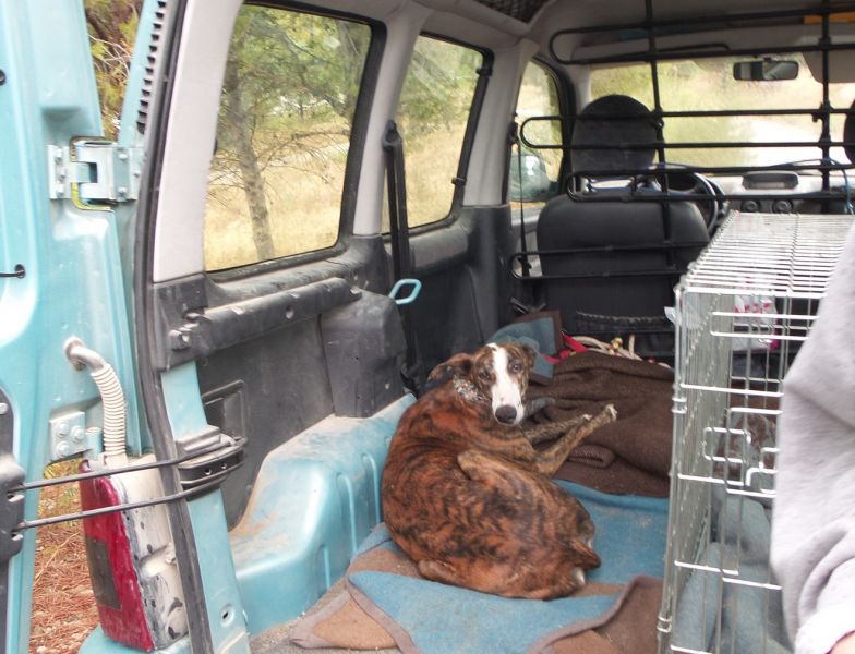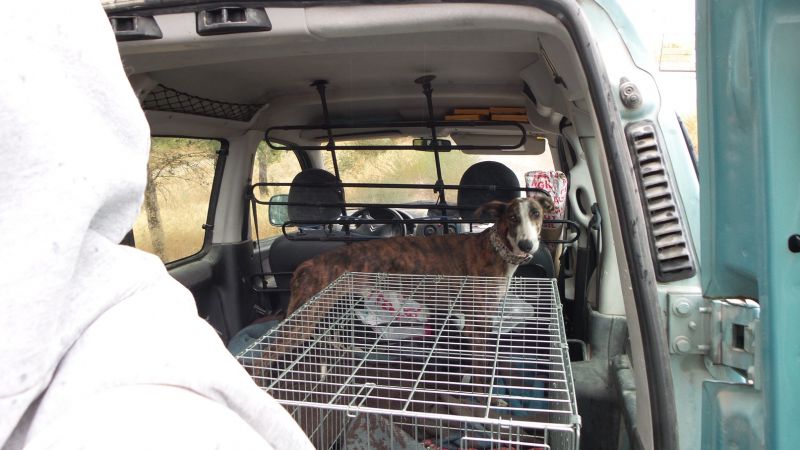 Ein anderer Fall: kurz bevor wir in Zaragoza ankamen, rief die Polizei an, dass auf der Straße ein angefahrener Galgo liegt. Die befreundete Tierschützerin hat den hübsch gestromten Galgorüden geholt und zum Tierarzt gefahren, da er sichtliche Schmerzen hatte. Der Tierarzt sagte nur lapidar, dass nichts gebrochen wäre, er also außer Schmerzmitteln nichts tun könnte... So haben sie ihn erstmal im Auto gelassen, mit der einzigen Möglichkeit, ihn später ins Tierheim Zaragoza zu bringen, wo er mit aller Voraussicht in der Tötungsstation landen würde. Aber ihnen fehlte schlichtweg die Möglichkeit den armen Kerl zu pflegen und zu versorgen.