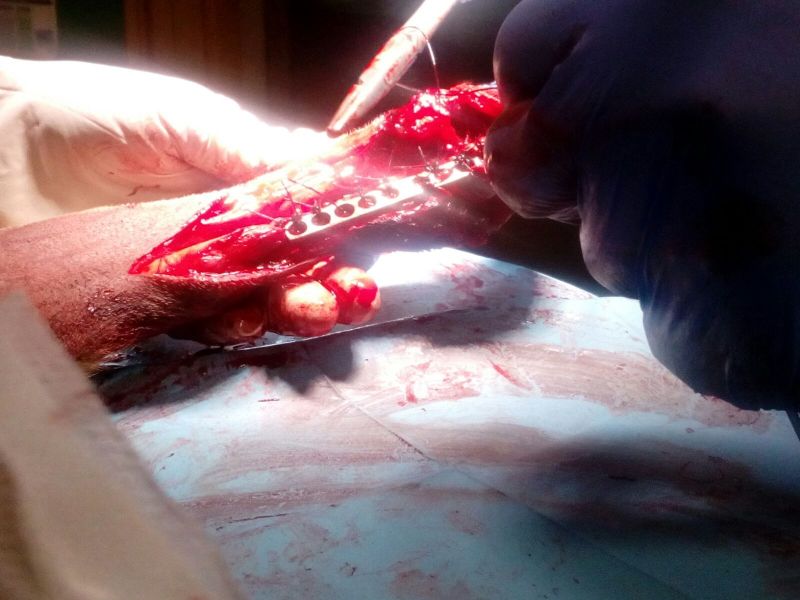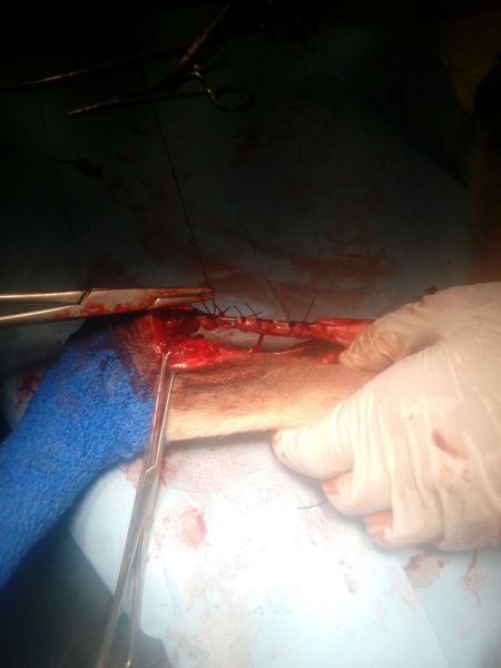 Pichin konnte zu Andrea nach Manresa und die war mit ihm bei der Tierärztin. Sie meinte sofort, dass sie die Platte die im eingesetzt wurde wieder rausnehmen muss, weil man so einen Abriss der Sehne nicht operiert. Am Donnerstag wurde Pichin also nochmals operiert: die Platte ist entfernen und das Bein über eine externe Fixierung ruhig gestellt. Die muss er nun ca. 1 Monat tragen, um so die Flexion des Tarsalgelenkes zu vermeiden. Danach werden wir feststellen in wie weit er die Sehne wieder benutzen kann.